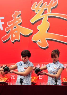 2010年3月20日,湖北省宜昌市第二届萧氏春茶节开幕,来自全国各地的品牌代理商和10000多名消费者,现场观摩现代洁净化设备洗茶制茶工艺,”零距离”观看制茶、炒茶过程,欣赏茶艺表演,品尝一杯新茶,将新茶免费赠送给80岁以上老人。同时举行新茶产品拍卖和捐赠活动,宜昌市夷陵区萧氏茶叶公司的128克新茶在24轮竞拍中拍出18000元的高价,竞拍款当场由萧氏公司捐赠给了夷陵区邓村乡江坪小学。本报视界网张国荣摄