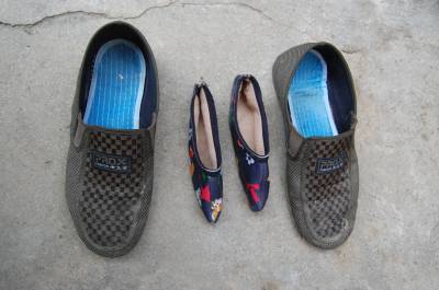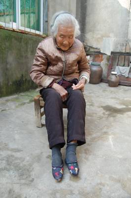 陈秀英老人早年从云梦县曾店镇朱桥村庙陈湾嫁到婆家至今已经八十多年了。老伴早年惨死在日军炮弹之下,当年留下两岁半的儿子和五岁的女儿,现在女儿已经82岁了。老人现是五代人共享天伦之乐,有孙子、曾孙、玄孙女众多后人。老人耳聪目明,自己洗涮衣物,生活自理。老人从儿时起就遵从当时社会风俗,年少缠足,至今一直是“小脚女人”,依靠着这“三寸金莲”的尖形小脚,行走在家里家外,劳作生活。而今,缠足的陋习早已经彻底被废除,曾经风情万种风靡中国大地千年之久的“三寸金莲”,就如古代妇女的命运,从千年前的南朝而来,又随着历史的车轮而去。“弓鞋绣履”“小脚鞋”而今少之又少,现存这样百岁的尖形小脚老人更是少之又少,这是仅存的最后的“三寸金莲”。经过缠裹后的尖形小脚“三寸金莲”的老人在不多的时日将从中国历史上永远消失。本报视界网 陈保忠 摄