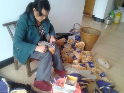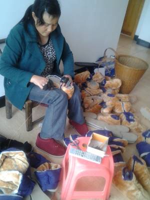 宣恩县李家河乡留守妇女李英在从乡集镇鞋厂领回棉布鞋在家里用手工加工。笔者摄于11月3日。 据了解,访乡已有10多位农民到外地打工学到一技之长后,回家办起了布鞋厂,主要招录当地剩余劳力就近就业。目前,有200多留守妇女在这些布鞋厂打工就业,她们可以把产品带家里做,这样既照顾了家庭和孩子上学,又每月还可争到2000元左右的收入。(陈开银) 联系;宣恩县李家河乡政府陈开银 电话:18064257256