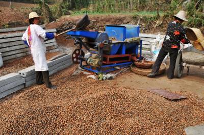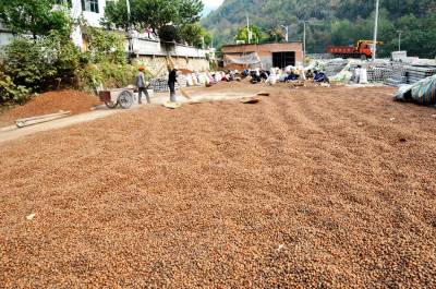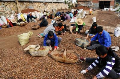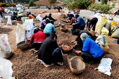 11日4日,郧县青曲镇巷子囗村的村民正在为60岁的村民姜天科帮工,今年姜天科收购山上的野橡子达25万斤,每斤橡子6角钱,村民帮工每天还挣近100元钱,每年姜天科收购的橡子加工成淀粉都成了俏山珍,郧县许多农民根据季节不同都发起了山货财。 夲报视界网周家山 王燕摄