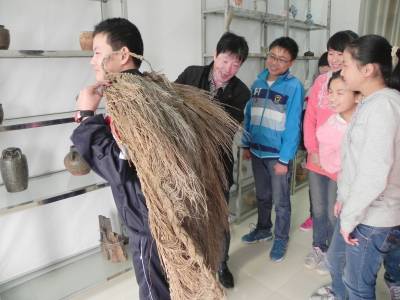 民俗文化走进山村校园 11月4日,郧县青曲镇初级中学教师杨正林帮助学生披上蓑衣,让学生们感受地方民俗文化。该校发动全体师生把即将消失的老物件寻回校园,并在校园里自建了一个80平米的民俗文化展览馆,展览馆设有“倾听远古呼唤”、“触摸平民生活”、“感受旧时百工”、“体味先农辛劳”等4个展区,陈列有农桑器具、日用陶瓷、建筑砖瓦等实物展品500余件。 (本报视界网 张传郧 摄)