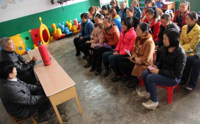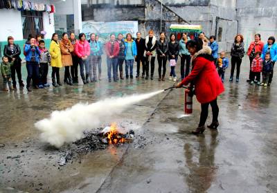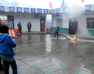 11月4日,金贝贝幼儿园安全管理员正在消防员的指导下学习使用灭火器灭火。全国第23个“119”消防日即将来临,巴东县金果坪乡安监办对全乡中小学、幼儿园的安全管理员进行一次消防安全知识培训,现场演示灭火器材的使用和火场逃生技能。