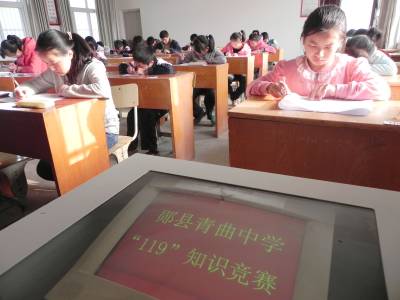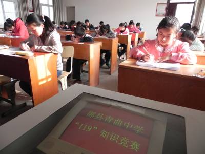 好好学习 天天“消防” 11月6日,郧县青曲镇初级中学参赛选手在“119”知识竞赛中认真答题。今年“119”消防日宣传活动的主题是“认识火灾、学会逃生”,郧县各乡镇中小学校围绕主题,结合实际,创新思路,加强谋划,通过开展形式多样的消防宣传教育活动,广泛宣传消防法律法规、防火、灭火和疏散逃生常识,提高师生消防安全意识、普及火灾逃生常识、增强自防自救能力。 (本报视界网 张传郧 摄)