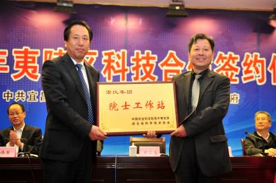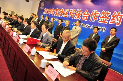 2013年11月9日,宜昌市夷陵区举行科技合作签约仪式,由中国工程院院士陈宗懋在当地萧氏集团建立的湖北首个茶叶院士工作站在仪式上正式授牌成立,来自全国的20所高校、科研院所与夷陵区22家高新科技企业达成产学研合作协议41项,建立校企共建研发中心5个。据悉,这些合作项目涵盖新材料、新能源、生物医药、新型建材和以柑橘、茶叶、畜牧为支柱的现代农业领域,科研经费总投入达到5665万元,预计新增产值33.33亿元,利润可达4.988亿元。 本报视界网 张国荣 摄