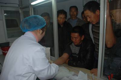 11月9日,一名检验科医生正在为参检者采集血样。为加强生猪屠宰管理,保证生猪产品质量,保障人民群众的食用安全和身体健康,水布垭镇组织卫生院等单位对该镇46个村的屠工进行全面免费体检并建立健康档案,最后为体检合格者颁发卫生预防性健康体检健康证明。 本报视界网陈美强 谭显龙摄