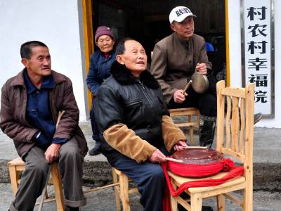 11月15日,来凤县革勒车乡大地龙村6组76岁盲人村民姚贤灯,在“农村幸福院”里为留守老人演唱三棒鼓《党的恩情不要忘》。双目失明的姚贤灯,多年来完全靠“听”电视了解党和国家的新变化、新成就及各项惠农政策。今年,在他所居住的令家界院落建起了“农村幸福院”,让众多空巢、留守老人老有所乐,他更是激动不已,迅速将自己所听到的新政策编成三棒鼓和山歌唱词经常为幸福院的老人们义务演唱。