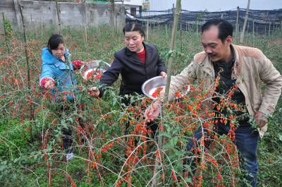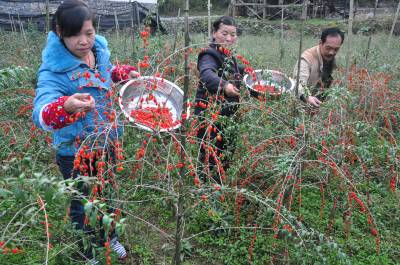 湖北杂交枸杞助农增收 11月14日,建始县业州镇金银店村三组湖北杂交枸杞示范园里,村民们正在忙着采收湖北杂交枸杞。 今年,建始湖北杂交枸杞栽种面积达到1200亩,挂果丰产面积达到200亩,亩产湖北杂交枸杞1400斤,亩收入7000元。200亩丰产田,可为村民增收140万元,成为农民增收又一新产业、新渠道。 视界网签约摄影师 卢发荣 摄