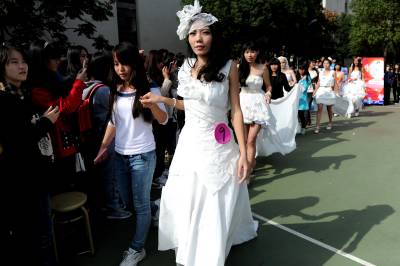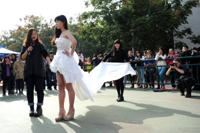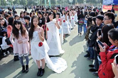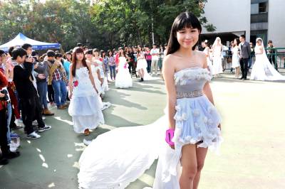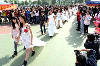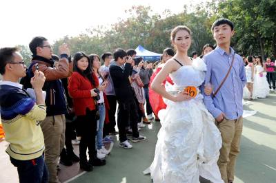 欧式风格、漫画风格、夏威夷风……昨日(11月15日),湖北经济学院法商学院社团联合会举办的法商之星婚纱设计大赛上,25位“模特”身着3米卫生纸制作的创意设计婚纱行走校园,惊艳全场。该校社团联负责人胡敏介绍,该活动旨在倡导低碳环保理念,培养学生实践创新能力。