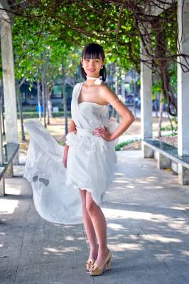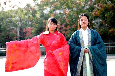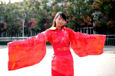 法商金融Q13401周旗航同学设计的是一套用卫生纸做成的汉服婚纱参赛,为制作这件汉服婚纱,她先将整个卫生纸染成红色,然后按照设计图案裁剪而成,前后花费10多天。“我认为中国传统汉服婚纱具有它与西洋婚纱不同的独特魅力,设计这套婚纱的目的是为了向同学们展示我国优秀的传统文化。”周旗航说。