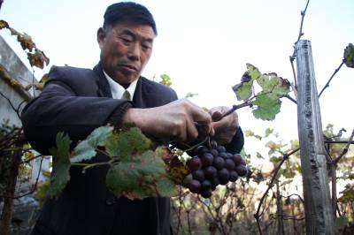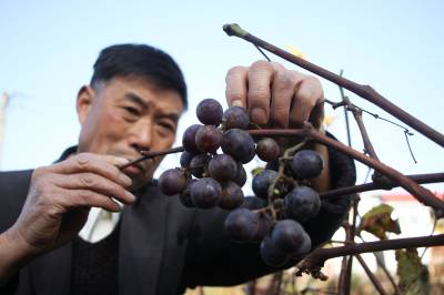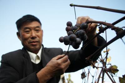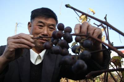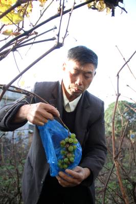 16日,竹溪县蒋家堰镇中原村农民肖高升查看成熟的三季葡萄。入冬不久,葡萄叶子陆续掉了,但在竹溪县蒋家堰镇中原村肖高升葡萄园里,光秃秃的枝干上却挂着十多串紫色、青色葡萄。67岁的肖高升经过数十余年培育,今年终于在二季葡萄的基础上成功培育出三季葡萄。其培育的三季葡萄比二季晚了一个半月。肖高升介绍,三季葡萄主要是在二季葡萄开花时,做好修剪、留芽等技术性工作。他表示还将继续探索,提高三季葡萄产量。