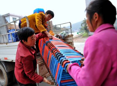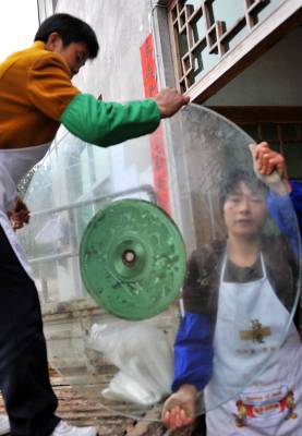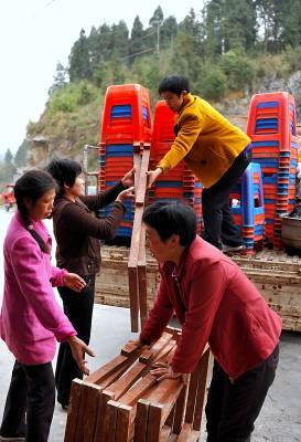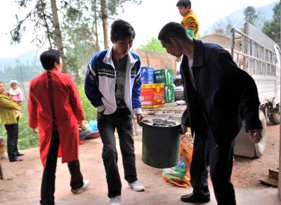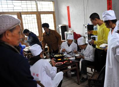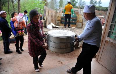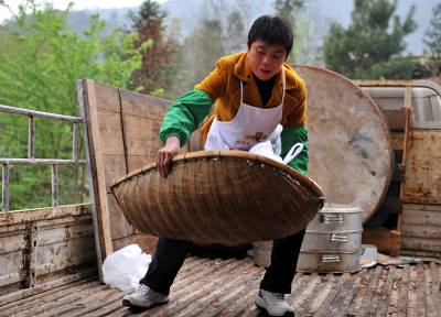 3月22日早上7点钟,宣恩县椒园镇黄坪村一酒楼的师傅开始将餐具、食品装车——她们要去8公里外的香树林村一农户家中,为该农户家整喜酒办酒席。准备好桌椅板凳锅碗瓢盆、油盐酱醋鸡鸭鱼肉等物品装上满满一车,便成为穿行在乡间的一间”移动餐厅”。据酒楼老板介绍:目前在该县从事此种行业、专为农村红白喜事上门提供”一条龙”餐饮服务的大约有30家,每家都有10-30名经过培训的农村妇女为主的从业人员,平均每人每天收入在70-80元左右。而”移动餐厅”的收费,要么按照主要提供加工原材料25元/桌的标准收取加工费,要么不由主人提供原材料而按照180—200元/桌的标准包干。(视界网签约摄影师:宋文摄)