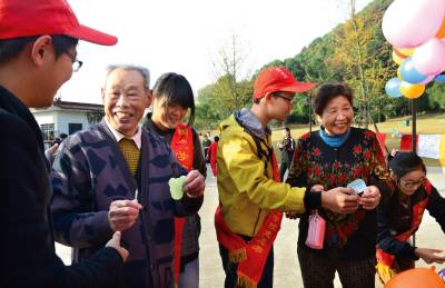 大学生们亲手制做千纸鹤、温馨问候语送给到公园游玩的市民,向过往人们送一个微笑、送一声问候,表达祝福