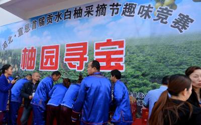 11月16日,人们在参加“柚园寻宝”、白柚采摘等比赛活动。 当日,湖北宣恩首届贡水白柚采摘节在高罗乡板寮村举行。由贡水白柚协会组织各专业合作社参与的采摘节,包括白柚品鉴、柚园寻宝、吃柚比赛等活动。采摘节上,来自全国各地的加工、销售企业与各白柚专业合作社鉴订了2.18亿元的采购合同。 据了解,贡水白柚是宣恩县财政、农业、扶贫开发等多部门近些年扶持农村发展的特色产业,种植面积达10万亩,产值2.5亿元。(本报视界网 谭玲摄)