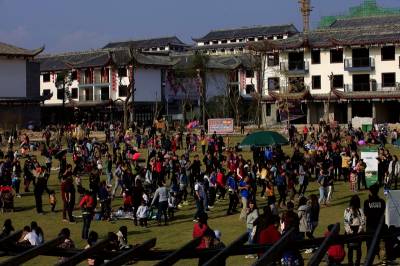 对外开放不久的恩施土家女儿城,现在成了恩施城区市民一处休闲养生购物游乐的新宠。近几天,阳光明媚,风高气爽,市民们纷纷来到女儿城的草坪上放松心情,体验快乐。这是11月17日女儿城里一处场景。