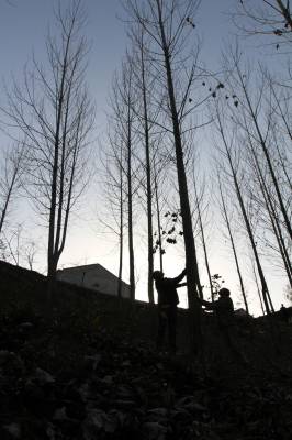 图四:农户房前屋后的空闲陡坡地的林木长大成林,代大明(左)轻抚大树,心里美滋滋的