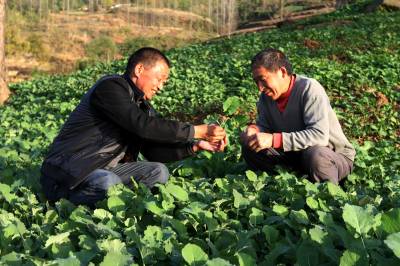 图五:代大明在向农民讲解油菜苗防虫、田间管理经验
