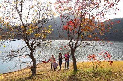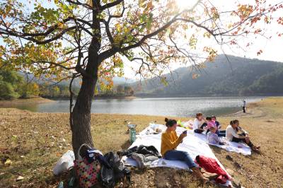 昨日,黄冈市麻城夫子河镇大石板水库旁,游人在尽享秋日阳光。进入深秋时节,地处大别山腹地的鄂东地区秋高气爽,层峦叠翠,色彩斑斓,如诗如画,吸引众多市民休闲赏秋。 视界网 邱新明 摄