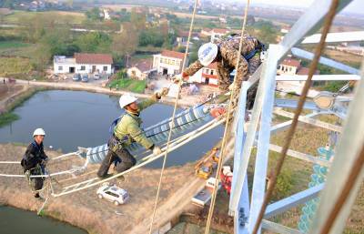 11月18日,在荆州地区220千伏楼子河至荆州南输电线路1号高塔上,湖北省电力公司施工人员进行紧挂导线施工。当日,经过6个月施工,该线路进入最后的架线施工阶段,为年底完工迎峰度冬创造条件。