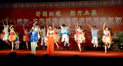 “情满江城、魅力土家——武汉·五峰手拉手”文化交流活动,11月18日晚,在武汉市江汉区举行了专场巡演晚会。此次活动由武汉市委宣传部、武汉市文化新闻出版广电局和五峰土家族自治县委、县政府主办,将在该市各区巡回举办15场,11月4日起至12月2日结束。 当晚的巡演,由五峰民族歌舞剧团和江汉区文体旅游局联合呈现。五峰民族歌舞剧团献上了极具土家特色的山歌对唱、男女声独唱、南曲歌舞、双人舞以及刚刚荣获全国群星奖的土家族民间舞蹈“五峰板凳龙”等;江汉区文化馆表演了舞台剧《情满社区》、独唱《情满江汉》。 据悉,去年6月该市对口支援五峰以来,江汉区在市委、市政府统筹指导下,对口支援五峰乡镇,积极创造条件为乡镇提供人力、物力、财力、智力等多方面的支持,并坚持“输血”与“造血”相结合,建立了从人才、技术、资金、项目等多方面对口协作的有效机制。活动旨在贯彻党的十八届三中全会精神,以工促农、以城带乡、工农互惠、城乡一体的新型工农城乡关系。推介五峰生态文化旅游资源、促进民族特色文化走出山外,让更多的武汉市民了解五峰、走近五峰、支持五峰,以文化交流互动为纽带,增进两地友谊,进一步推动合作共赢。
