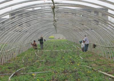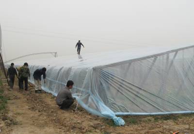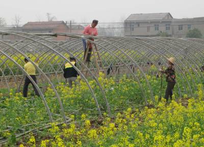 鄂州作为全省城乡一体化的试点城市,该市在扎实推进城乡一体化工作的情况下,大力发展产业经济,以帮民富。图为3月22日,该市鄂城区路口社区蔬菜园员工正在抢晴天搭建蔬菜大棚。
