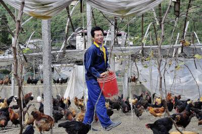 11月25日来凤县大河镇满店村村民曾山林正在葡萄架下给土鸡喂食。