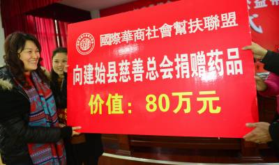 11月26日,建始县慈善总会从国际华商社会帮助联盟常务理事、办公室主任刘小平接过用于肝病患者的价值80万元药品捐赠。