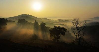 秋天的早上,太阳透过晨雾,一道道的光是那么神奇漂亮 如梦如幻