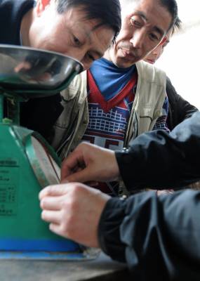 3月19日,宣恩县长潭河侗族乡中坝村的茶农为了保证自己的利益,要求采收人员对称量工具进行校准。自春茶采摘以来,恩施州各地采茶忙、卖茶忙的情景处处可见,鲜叶收购价格和成品茶销售价格与往年相比,大幅上涨,形势十分喜人。