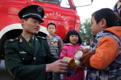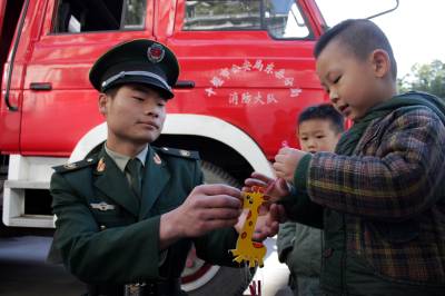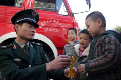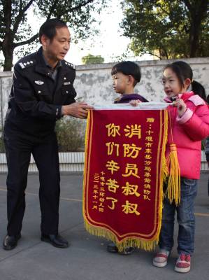 当日是感恩节,为了增强们孩子们的崇敬之情,湖北十堰市三环幼儿园小朋友和家人一起亲手制作礼物,并将礼物送到十堰市公安局东岳分局茅箭消防中队的消防叔叔手中。活动中,小朋友们还观看了消防员叔叔表演、试穿消防服、了解消防工作流程等。孩子们通过参加本次活动,感恩的种子播撒在他们的心田,他们也对消防队员的崇敬之情。(视界网 章新俊)