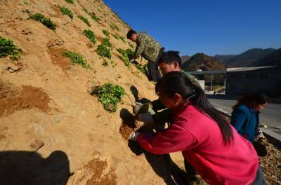 11月29日,30多名工人在湖北省十堰市张湾区汉江街办桐树沟村张家沟村级公路边栽种红花草。据悉,入冬以来,张湾区为了打造十堰车城后花园,创建湖北省森林城市,按照宜树则树、宜草则草、乔灌结合、木本植物和草本植物搭配的原则,加大对工业园区、汉江物流园区、福银高速公路和国道、省道等两边山体的绿化和美化。截止目前,全区已投入资金8000多万元,造林和喷泥浆播种草籽2810亩,公路两边植树3万多米,共计植树造林120多万株。