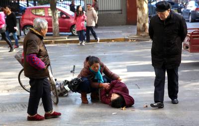 11月29日,一名与老人素不相识的中年妇女正在向倒地的老人询问情况。当日,在湖北省襄阳市中心医院门口,一名68的老太太骑车时突然倒地,在老人身后骑车的一名中年妇女立即停下来,这名素不相识的中年妇女向摔倒的老人询问情况,当得知老人只并无生命危险只需要静卧调整好时,一直守候在老人家身边。在卧地老人状况较好后,将老人扶至临街一处蛋糕店休息。老人静坐20分钟后自行回家。