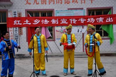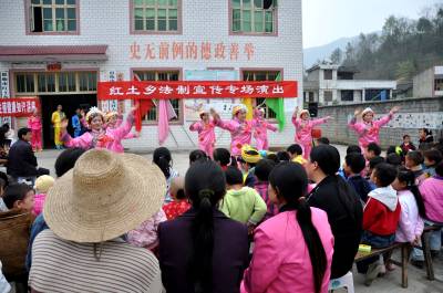 3月24日,笔者在恩施市红土乡天落水村看到,农民正在观看法制宣传文艺节目。据悉,该乡义务流动法制宣传队由民间艺术团和乡直有关单位法治宣传积极份子组成,深入乡村进行巡回演出,将一道道丰盛的”文化法治大餐”送到广大农民的家门口,让百姓在家门口过足戏瘾。据了解,该乡积极开展各种法制活动,义务流动法制宣传队每年深入村组义演达30多场次,受教育群众3万多人次。。图1、农民正在观看法制宣传文艺节目。图2、表演三句半《说说交通安全法》图3、表演耍耍《学习计生新条例》图4、精彩的表演,让农民朋友看得乐不可支。点评:”五五”普法规划,农民首次被确定为我国法制宣传教育的重点对象。恩施市红土乡利用流动的法制宣传队等多形式将法制宣传到农家,打造法治新农村。促进了全乡的和谐平安,也推进了乡域经济社会又好又快地发展。这一作法值得借鉴。(通讯员彭绍峰摄)红土乡政府13329820218
