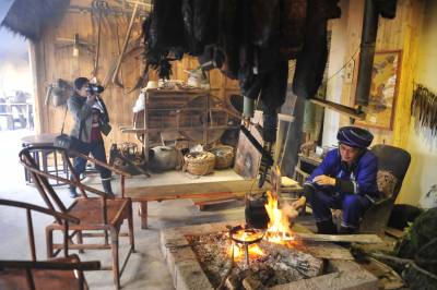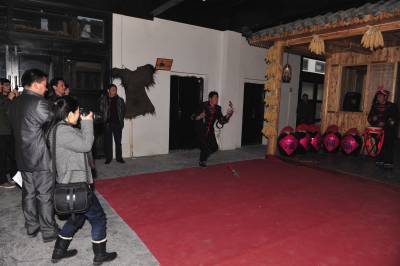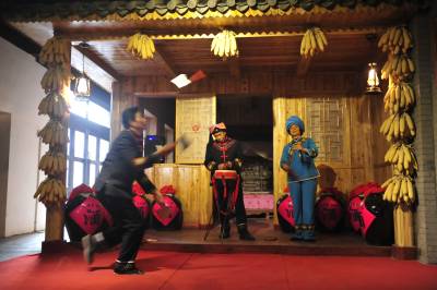 土家文化活态传承 11月29日,在湖北省恩施自治州土家女儿城,民间艺人正在表演民俗节目。 在恩施土家女儿城土家民族文化博物馆,有签约民间艺人50人,其中20位民间艺人常年驻演、挖掘、传承、展演摆手舞、茅古斯、肉连响、喜花鼓、耍耍儿等土家族非物质文化艺术,让游客体验到地道的土家族民族风情。 视界网 谢顺 13277590198