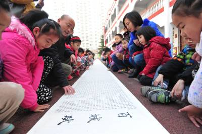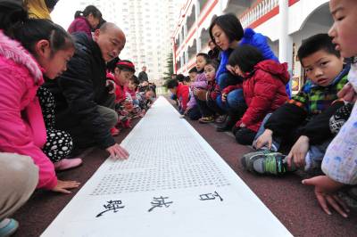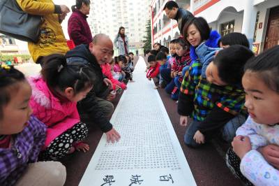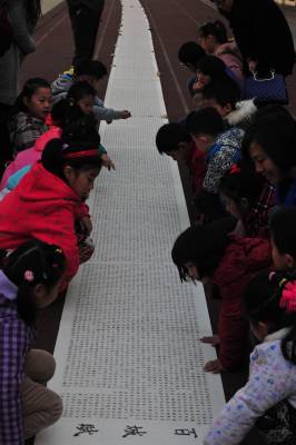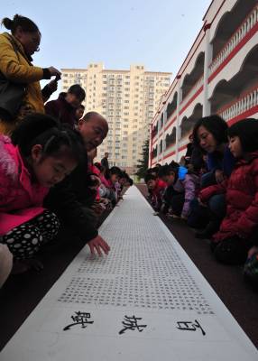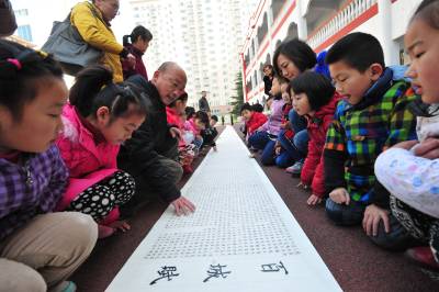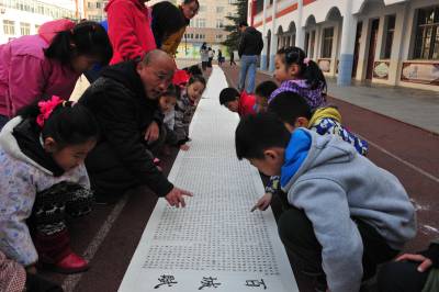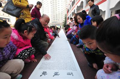 12月日,在湖北省襄阳市米公小学,老师毛东风(左三)在向学生和各界朋友展示自己刚刚完成的160米小楷书法长卷《百城赋》。据介绍,经过30个月的书写,他的20余万字160米长的书法长卷《百城赋》创作完成,也成为目前在国内罕见的小楷书法长卷。
