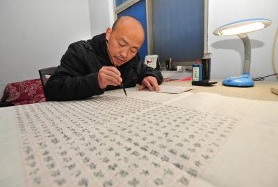 毛东风是米公小学的 体育老师,今年50岁,在校园浓厚的书法环境熏陶下,他萌发了创作热情,当光明日报刊登《百城赋》后,他就收集了这100篇文章,并开始书写,经过30个月的书写,书法长卷在近日完成,并准备装裱对外展示。