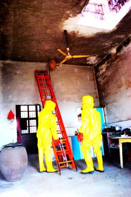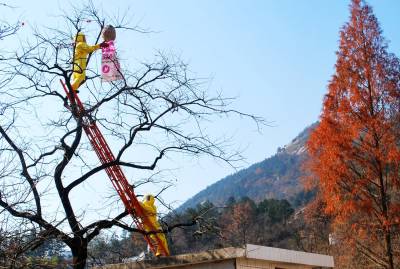 1日上午,罗田县平湖乡刘家庄村一组农民丁科全家厨房内的一个“马蜂窝”被“全副武装”的罗田消防战士一举端掉,使准备回家过年的丁科全夫妇解除了后顾之忧。这天上午,除了帮丁科全家端掉一个“马蜂窝”,还端掉两棵柿子树上的“马蜂窝”。据了解,近年来罗田山区农村不少地方柿子树等树上都被野蜂做了窝,严重的威胁着人们的生命安全。罗田县消防中队今年共端掉300余个“马蜂窝”,为群众消除了安全隐患。图为消防战士在柿子树上摘除“马蜂窝”时的情景。