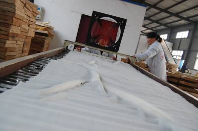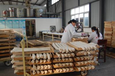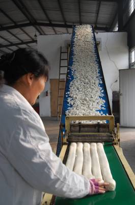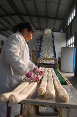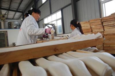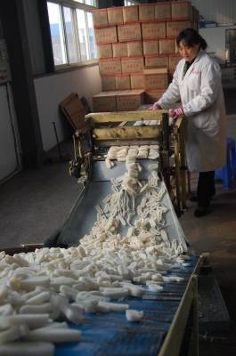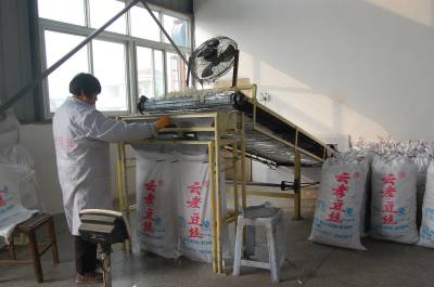 2013年12月5日,湖北王翔食品有限公司员工忙着生产湖北传统美食“云孝豆丝”。 豆丝,也叫豆皮,是以大米为主料,辅以或是绿豆、或是花生米、或是玉米、或是荞麦等为原料,磨碎成浆,在锅里摊成皮,切成丝,晾晒后收储。食用方法有汤豆丝、干豆丝、炒豆丝等多种吃法。豆丝是湖北人喜爱的传统食品之一。云梦县传统食品老艺人王祥元,于1999年研制发明豆皮成型机,获得国家专利,他将传统制作与现代工艺结合,生产出绿豆、黄豆、荞麦、玉米、鱼肉等多个豆丝品种,年产量150多万斤,产品俏销湖北、江西、河南、北京等地。本报视界网 陈保忠 摄