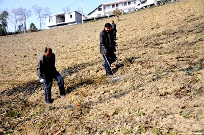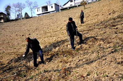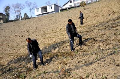 12月7日,在恩施市红土乡乌鸦坝村有机茶园,“土专家”正在给刚栽的新茶苗淋稳根水。