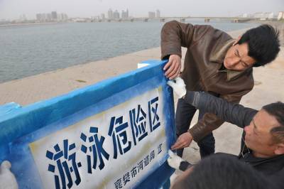 3月25日,襄樊市河道管理局工作人员沿江重新粉刷标语牌,针对崔家营航电枢纽工程蓄水后,汉江襄樊城区段水位上升后的水情变化,提醒市民在汉江边注意安全。