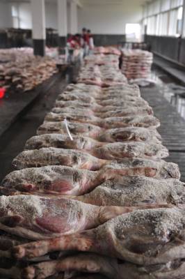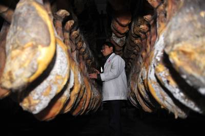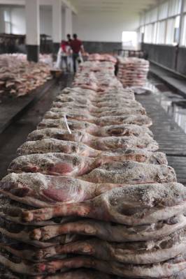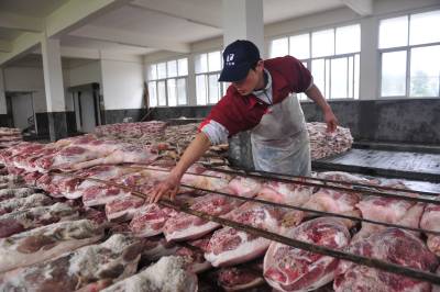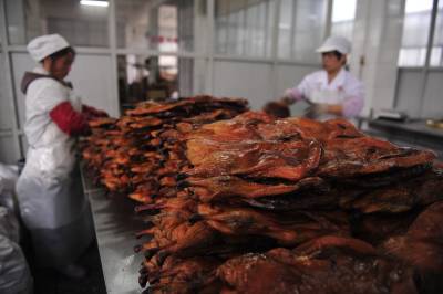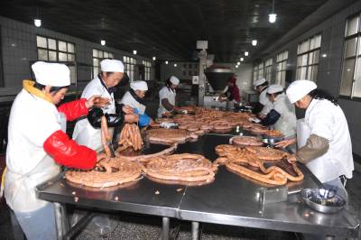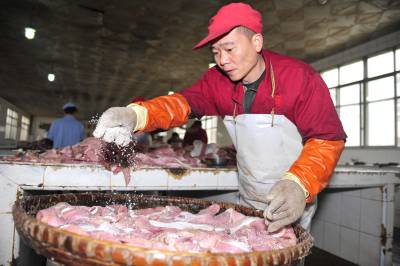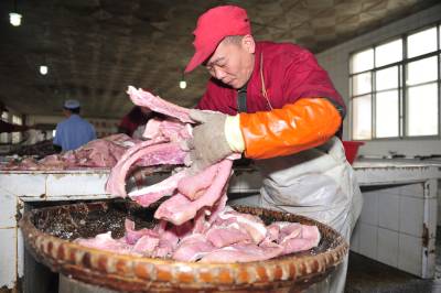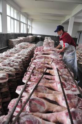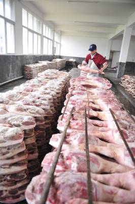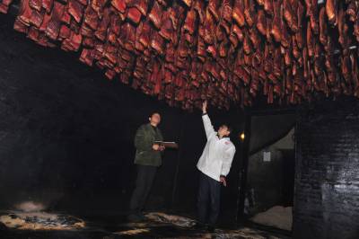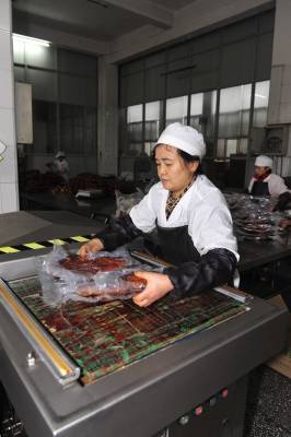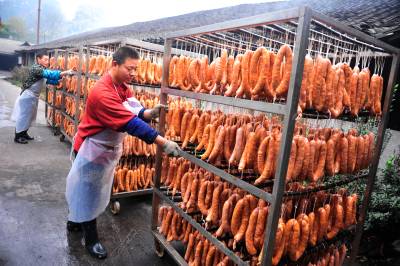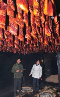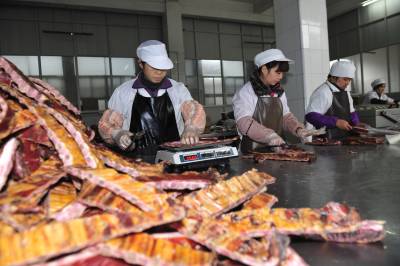 12月9日,在湖北省恩施市一肉制品深加工基地,工人正在加工、制作、烟熏、包装土家腊制品。