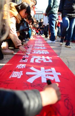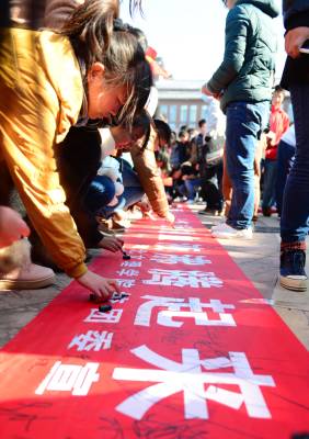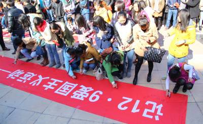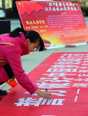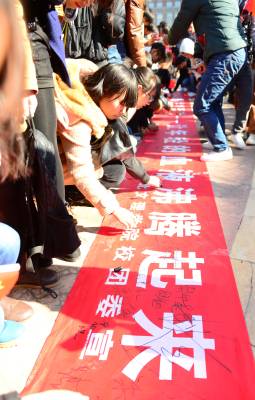 我们是中华人民共和国的儿女,我热爱祖国的每一缕阳光,热爱祖国的每一寸土地,运动我爱祖国黄皮肤黑眼睛的同胞,我爱祖国悠久辉煌的历史和灿烂无比的文化……12月9日,时值北平爆发12.9运动78周年,湖北文理学院数千名学生齐誓签名不忘129爱国主义。