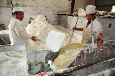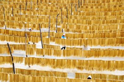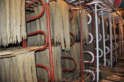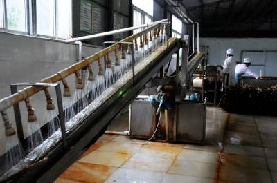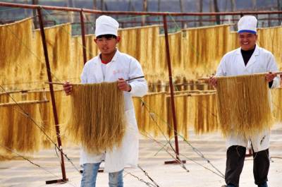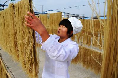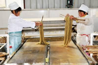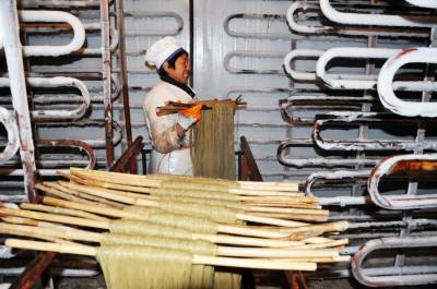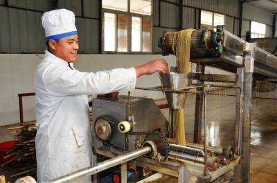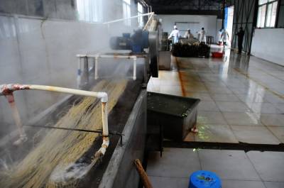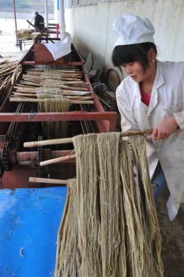 12月11日,郧县梅铺镇湖北郧县鄂鲁淀粉制品有限公司车间内首条无明矾老郧阳粉条生产线正在开足马力生产。过去传统粉条生产工艺需要加兑少许明矾才能生产,明矾对人体高血压、心脏病、脑血栓等疾病都有影响和副作用,为解决这一问题郧县鄂鲁淀粉制品有限公司董事长侯升春经过多年钻研和努力,终于研制成功国内首条无明矾不锈钢粉条生产线,并取得国家"实用新型发明专利"书,今年该公司又取湖北省粮食行业协会颁发的"湖北省第四批放心粮油,示范企业"证书,同时又获得了中国绿色食品发展中心颁发的"绿色食品"标志。为保障每年无明矾老郧阳粉条早点上市,公司董事长侯升春又打破传统粉条冬季进九封冻后才能生产上市的惯例,投资购进两座冻库对下线生产的粉条进行冻库冷冻,第二天上流水线解冻后凉晒的工艺,每年8月份就可以投入生产上市以抢占先机,今冬鄂鲁淀粉制品有限公司将加工生产无明矾粉条300万斤投放市场,目前无明矾老郧阳粉条市场供不应求,许多客户争购对人体无害的无明矾老郧阳粉条。