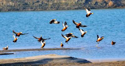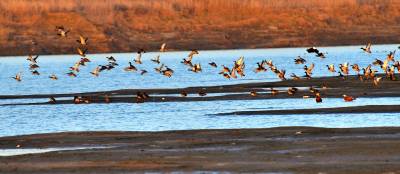 12月13日,一群珍稀候鸟赤麻鸭现身郧县汉江河畔 (如图)。每年11月到次年3月,万余只野生大雁、白天鹅、赤麻鸭、野鸭等野生候鸟在汉江郧县段越冬, 成为当地一道美丽的冬日风景。
