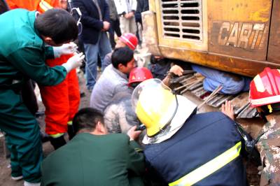 12月13日下午16时33分,湖北巴东县信陵镇山水龙城工地上一名男子被压在挖掘机下,身体被数根钢筋缠住,脚部、手臂等身体多处受伤,生命垂危。当地消防、医疗部门接到报警后,立即赶赴事故现场救援。