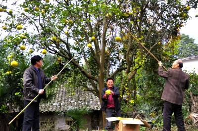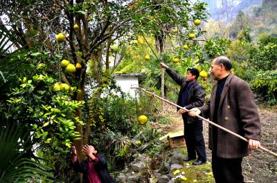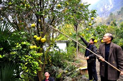 “创收庄园”采收忙 12月14日,在恩施市红土乡天落水村大坝组,老党员唐福元等人正在屋后采摘成熟的柚子。 近几年来,该乡在新农村建设中,充分发挥老党员、老干部、老教师的“标干”的作用,引领村民发展庭院经济,把农户房前屋后的空地种果树、建葡萄园,不需施肥、不需打农药,靠自然生长。既改观了村容村貌,又为农民带来了收入。让小小庭院成为农户创收增效的重要渠道,生态家园变身“创收庄园”。(本报视界网彭绍峰摄)