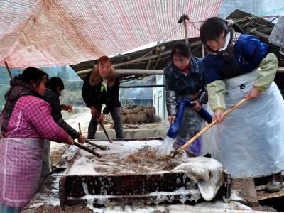 贾玉凤自办蕨粉加工厂,让农家妇女家门口就业 12月17日,来凤县革勒车乡豹子沟村蕨粉加工业主贾玉凤与农妇们一道加工蕨根粉。革勒车乡野生蕨资源丰富。2009年贾玉凤从浙江引进蕨粉加工技术,每年生产的60多吨蕨粉不仅销往浙江、深圳、上海等内地城市,而且远销日本、韩国。因市场需量增大,目前以在3个乡镇建立分厂,促成了近500个农村妇女在家门口实现就业。 本报视界网 姚丙然、张歌 来凤县革勒车乡文化服务中心 电话:13997799385