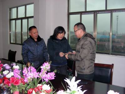12月17日,黄梅县纪委派出第二监察分局局长张申红(中)向湖北小蚂蚁金刚石工具公司总经理周林汇(右一)退还小池自来水公司多收的开户安装费2000元。前不久,该分局在小池临港产业园调查走访企业了解到自来水开户安装费偏高时,立即比照县城工业园区企业享受的优惠政策规定,责令小池自来水公司向3家企业退还多收的开户安装费9000元,有力减轻了企业负担,保障了企业发展。(本报视界网 吴志雄 摄)