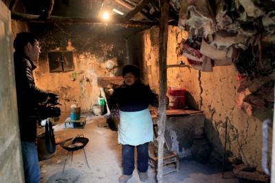12月17日,2名新华社记者在巴东县东瀼口镇石板村二组宋文楚垮塌的房屋前拍照。
