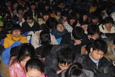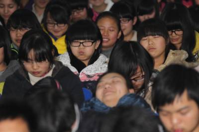 图为:心理咨询教师为300余名高三学生开展“想象放松训练”,学生入睡的情景。