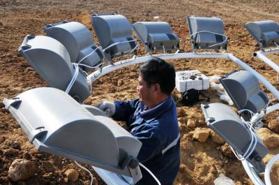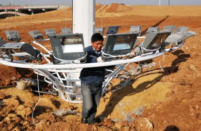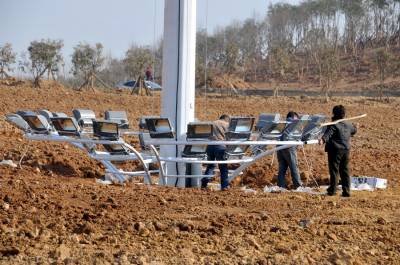 12月18日,技术工人正在湖北省郧县的“郧十”高速公路郧县互通安装4杆高35米的高杆灯,每杆高杆灯由32盏灯组成。“郧十”高速公路郧县互通联接线全长6.9公里,宽60米。东为“郧十”高速公路收费站,西为郧县郧阳汉江大桥,该工程于2012年1月11日动工,郧县互通安装高杆灯标志着互通工程建设进入尾期施工。 夲报视界网周家山 摄